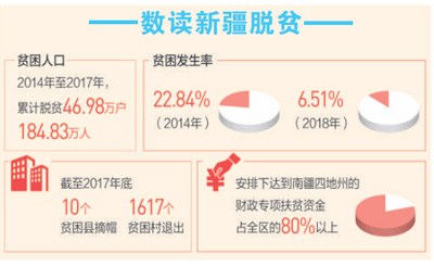 黨的十八大以來,新疆維吾爾自治區認真貫徹落實習近平總書記關于扶貧工作的重要論述,把打好精準脫貧攻堅戰作為推動黨中央治疆方略落地生根、實現新疆社會穩定和長治久安總目標的關鍵舉措,走出了一條具有新疆特色的脫貧攻堅之路。確定南疆四地州22個深度貧困縣及所轄192個深度貧困鄉鎮、1962個深度貧困村和162.75萬貧困人口,將其作為脫貧攻堅的重中之重、堅中之堅。大力實施特色產業帶動、轉移就業、易地扶貧搬遷、突破瓶頸制約等8個專項行動;圍繞新疆社會穩定和長治久安,實施邊境扶貧、基層基礎建設兩個專項行動。發揮貧困群眾主體作用,常態化開展感恩教育、民族團結聯誼等活動,深入推進“去極端化”教育,破除“等靠要”思想。