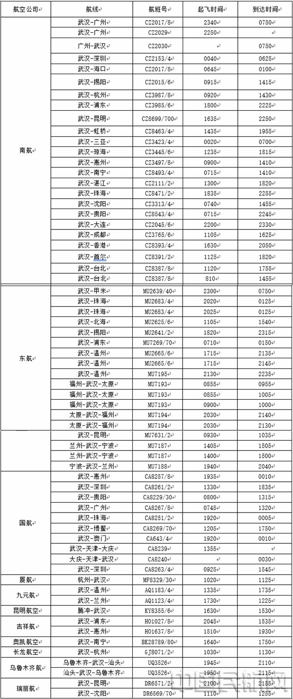 武漢機場重點增開了武漢往返上海、廣州、深圳等地的航班,其中上海和深圳每天新增4個往返航班,廣州每天新增3個往返航班,貴陽每天新增2個往返航班,福州、大慶、福州、太原、溫州每天則新增一個往返航班,春運40天,回鄉探親航班加班可達2000余班。加班后,上海、深圳、廣州的航班時刻基本可以保證"全天候"送您回家。