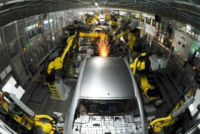 這是2018年4月21日拍攝的北京現代滄州工廠車身車間生產線。新華社記者 牟宇 攝