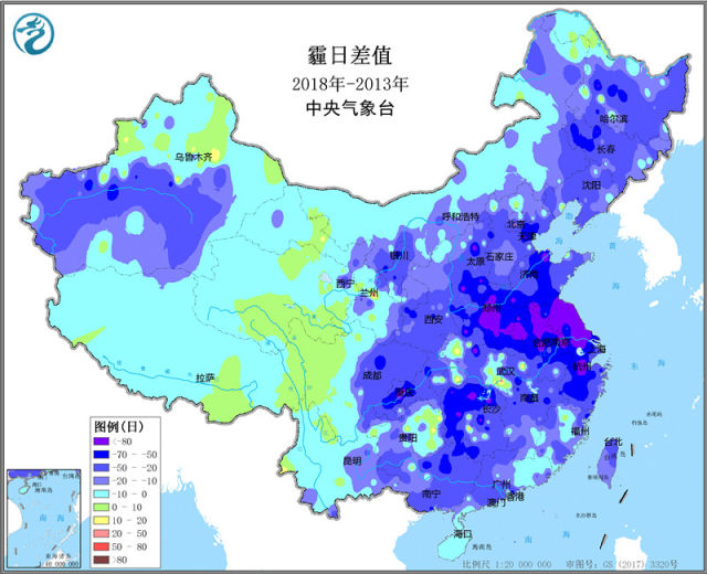 根據中央氣象臺的統(tǒng)計,全國大部分地區(qū)2018年霾日較2013年都有大幅下降,其中京津冀及周邊大部分地區(qū)霾日數(shù)下降超過30天,部分地區(qū)下降超過50天;長三角地區(qū)霾日數(shù)下降普遍超過50天;珠三角地區(qū)霾日數(shù)也出現(xiàn)明顯下降,部分地區(qū)下降超過30天;汾渭平原霾日數(shù)下降普遍超過20天;川渝地區(qū)霾日數(shù)普遍下降超過20天。