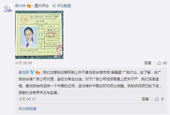 近日,麥當(dāng)勞在臺(tái)灣地區(qū)的一則作死廣告被挖出來了——在廣告中女主的準(zhǔn)考證國籍寫著臺(tái)灣,而且這個(gè)鏡頭足足停留了2秒鐘。雖然這是一支投放在臺(tái)灣地區(qū)的廣告,但麥當(dāng)勞所傳遞出來的立場,不僅激怒大陸廣大網(wǎng)友,也令不少島內(nèi)網(wǎng)友非常失望。