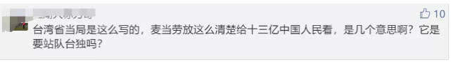 有網(wǎng)友表示:“麥當(dāng)勞官方需要給中國人一個(gè)解釋!”“麥當(dāng)勞是要站隊(duì)‘臺(tái)獨(dú)’嗎?”