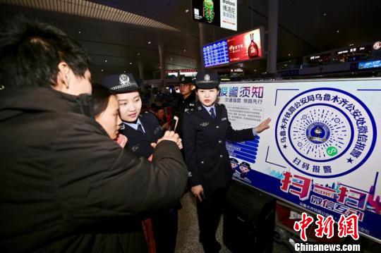 青年民警向旅客講解如何使用手機(jī)掃碼報(bào)警的使用方法。 李國(guó)賢 攝