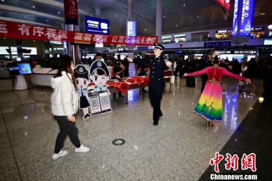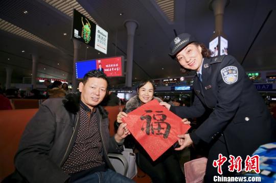 1月下旬,烏魯木齊鐵路公安處組織青年民警在烏魯木齊站開(kāi)展了“現(xiàn)場(chǎng)送福”“走進(jìn)智慧警務(wù)”“春運(yùn)添彩”活動(dòng)。活動(dòng)中警營(yíng)書法家現(xiàn)場(chǎng)書寫“福”字贈(zèng)送旅客,面對(duì)面向旅客宣講乘車安全知識(shí),現(xiàn)場(chǎng)與旅客互動(dòng)跳起了歡快的新疆舞,活動(dòng)受到廣大旅客的歡迎。
