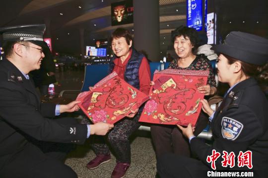 青年民警將“福”字送給兩位即將返回上海的老人,祝福她們健康幸福。 李國(guó)賢 攝