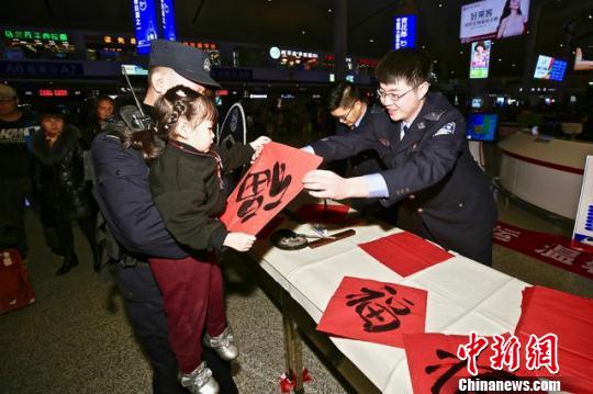 青年民警將書寫的“福”字送給候車的小朋友。 李國(guó)賢 攝