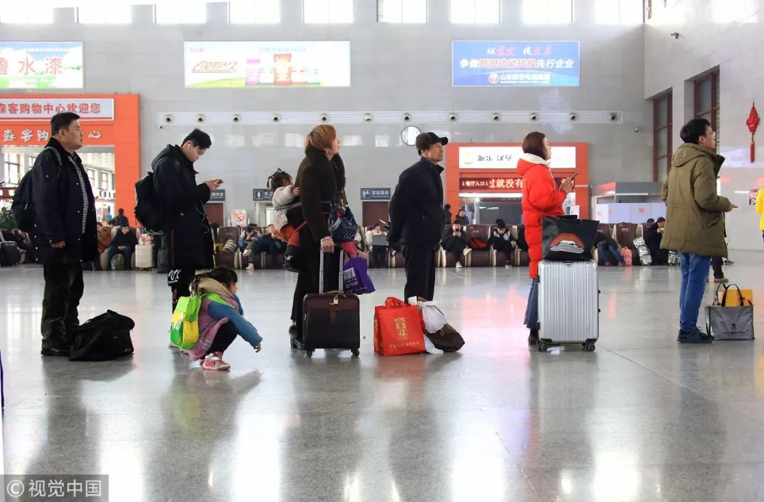 1月18日,山東省聊城市火車站候車大廳,乘客在等待檢票上車。