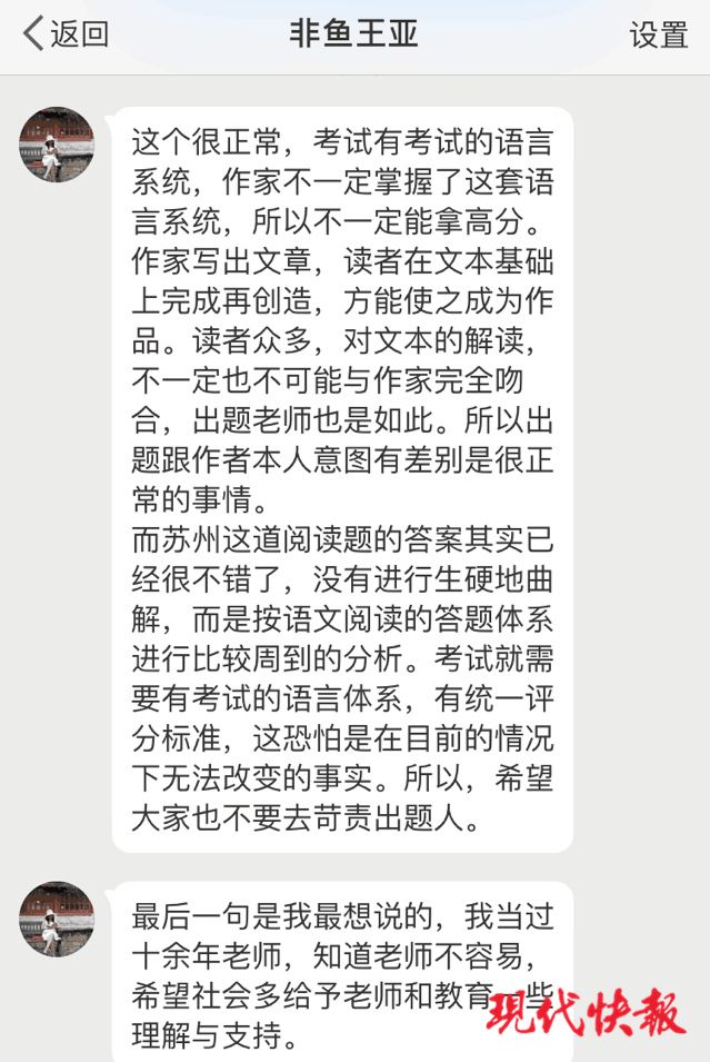 △閱讀理解原作者王亞老師發(fā)給現(xiàn)代快報(bào)記者的對(duì)話