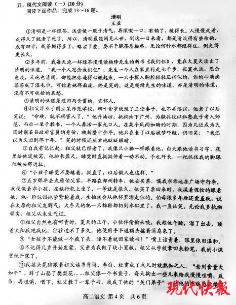 現(xiàn)代快報(bào)訊 1月21日,一則“高中閱讀理解原作者20分只得6分”的消息在網(wǎng)上引起了熱議。現(xiàn)代快報(bào)記者了解到,這是剛剛結(jié)束的蘇州高二年級(jí)語(yǔ)文統(tǒng)考中,有一道現(xiàn)代文閱讀理解題目,文章摘選自作家王亞的一篇散文《清明》。有學(xué)生考后通過(guò)微博直接聯(lián)系上了王亞,并請(qǐng)她作答,王亞也很快作了回應(yīng)。沒(méi)想到對(duì)照標(biāo)準(zhǔn)答案,20分的題目,王亞也僅僅能拿6分。