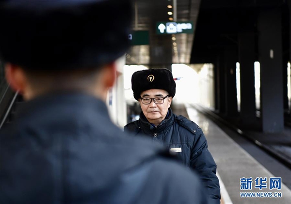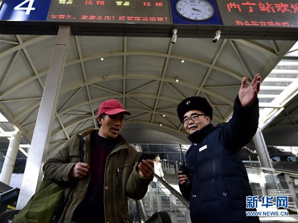 1月16日,李誠在西寧站巡查是否有旅客誤乘。新華社發(張龍 攝)