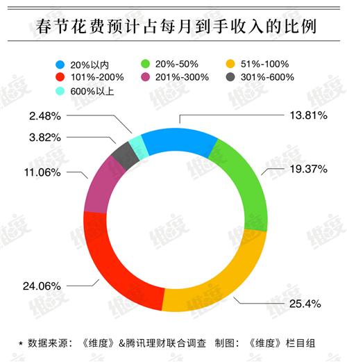 同時,《維度》的調查數(shù)據(jù)顯示,有41.42%的受訪者都表示春節(jié)的消費超過了自己一個月的到手收入,還有2.48%的人春節(jié)支出超出了自己半年的到手收入。