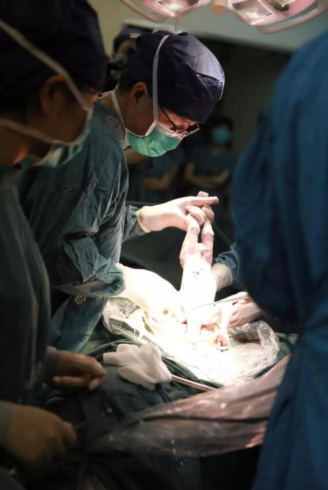 足月的胎兒對移植子宮造成的壓力,讓分娩的風險成倍增加,陳必良教授團隊選擇在孕33+6周進行剖宮產手術,迎接這個新生命的到來。2019年1月 20日,陳必良教授主刀施行剖宮產手術,劉朵朵教授配合手術,麻醉科陳敏教授施行麻醉。術中,采取腹壁縱切口完成子宮下段剖宮產,探查確認移植的子宮動靜脈縫合口、韌帶等恢復良好,手術歷時1小時6分鐘圓滿成功。新出生的寶寶身體各指標正常,體重2kg,身長48cm,apgar’s評分:1分鐘10分,5分鐘10分,10分鐘10分。剖宮產手術結束后,專家團隊沒有立即摘除子宮,小兩口還計劃著孕育二胎。