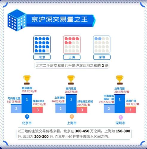 此前,9大城市前三季度的二手房市場,當時各城市中的社區交易量之王,如今地位依然穩固。其中,北京的融澤嘉園繼續拉大了與其他城市冠軍的差距。以三地的主流交易價格來看,北京在300-450萬之間,上海為150-300萬,深圳則為200-300萬,而三甲小區并非全部落入區間之內,比如北京的芍藥居北里小區,套均價格已經達到517萬元。