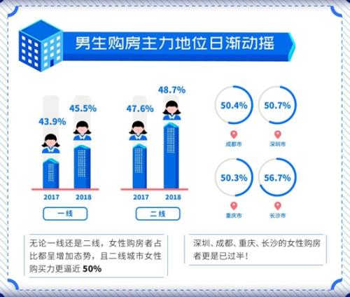 雖然從整體來看,男生仍然是購房主力,但只是微弱領先。并且,無論是一線還是二線,女性購房者占比都呈增加態勢,其中,長沙增幅最明顯,其次是成都、重慶及深圳等城市,這幾個城市的女性購房者已經超過一半。