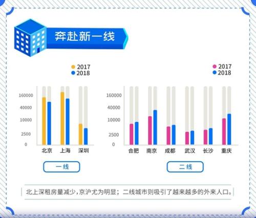 從《報告》中可以看出,相較于2017年,北上深的租房量都在下降,京滬尤其明顯,降幅超過2成。數據顯示,成都、長沙、合肥、南京、重慶、武漢為代表的二線城市正在吸引越來越多的外來人口,這些城市租房量的上升,開啟了人們奔赴新一線的大門。在超級城市之外“新一線”城市扎根,意味著更高的性價比。