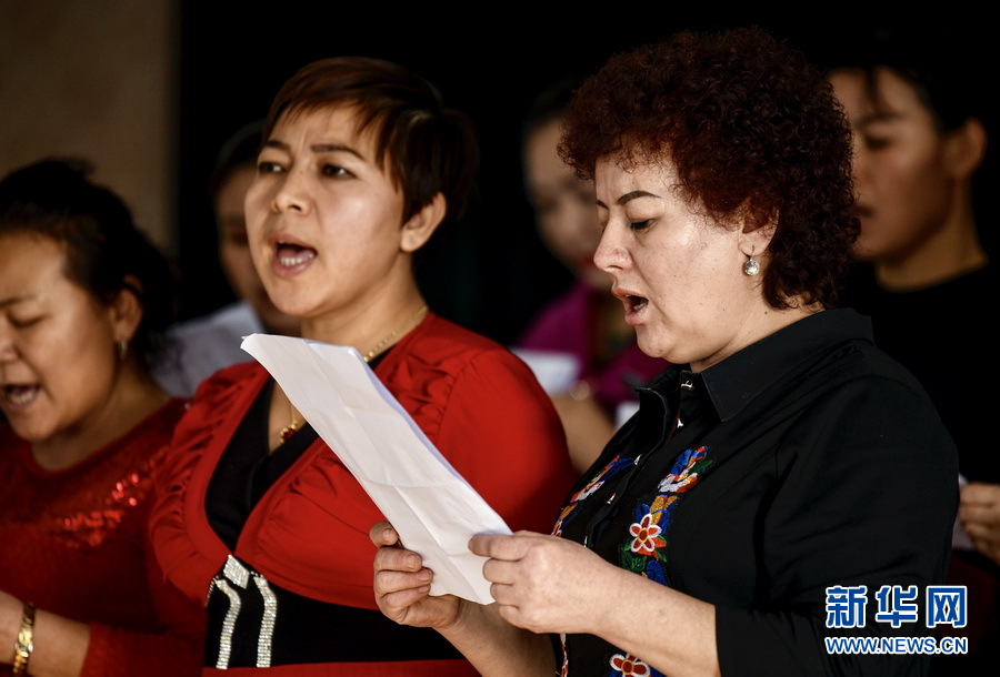 熱孜古麗·哈力克(左一)練習演唱歌曲。新華社記者 王菲攝