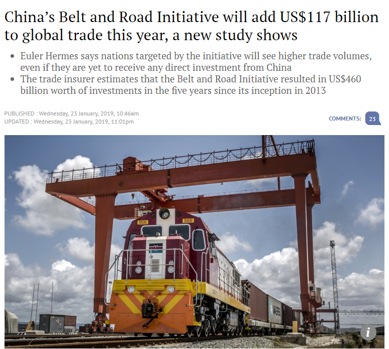 據香港《南華早報》網站1月23日報道,信用保險公司裕利安宜(Euler Hermes)的報告指出, 2019年,中國與“一帶一路”沿線國家的商品貿易總額預計將增長1170億美元(約合7943.9億元),其中出口額將增長560億美元(約合3802.2億元),從80個國家的進口額將增長610億美元(約合4141.7億元) 。在當前對世界經濟減速擔憂加劇之際,這將拉動世界貿易總額增長0.3個百分點,對世界經濟增長貢獻0.1個百分點。