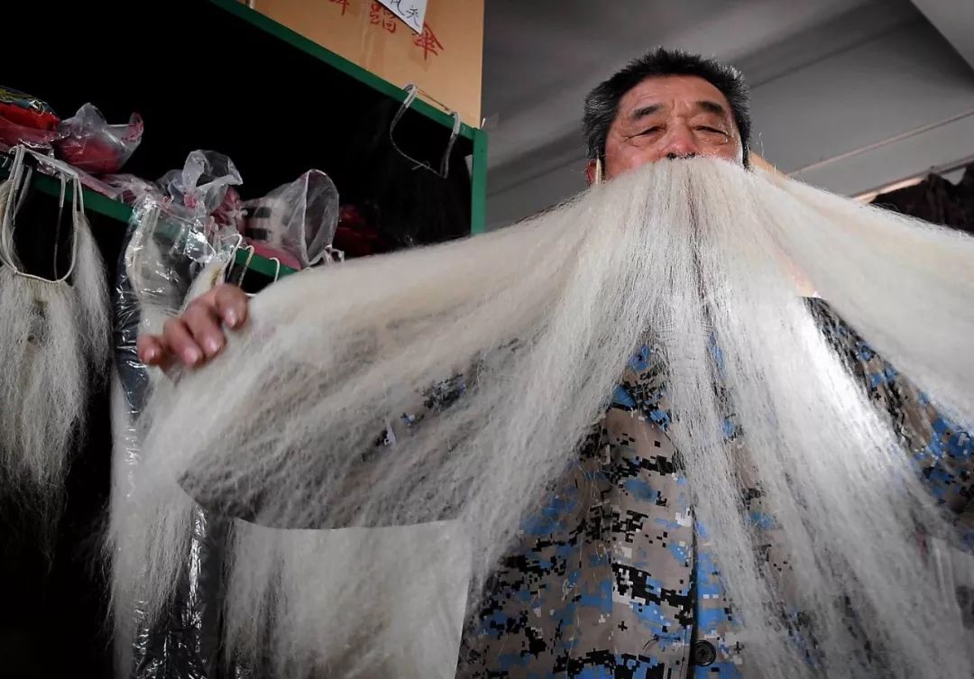 霍莊村村民在庫(kù)房?jī)?nèi)展示制作完成的胡須。