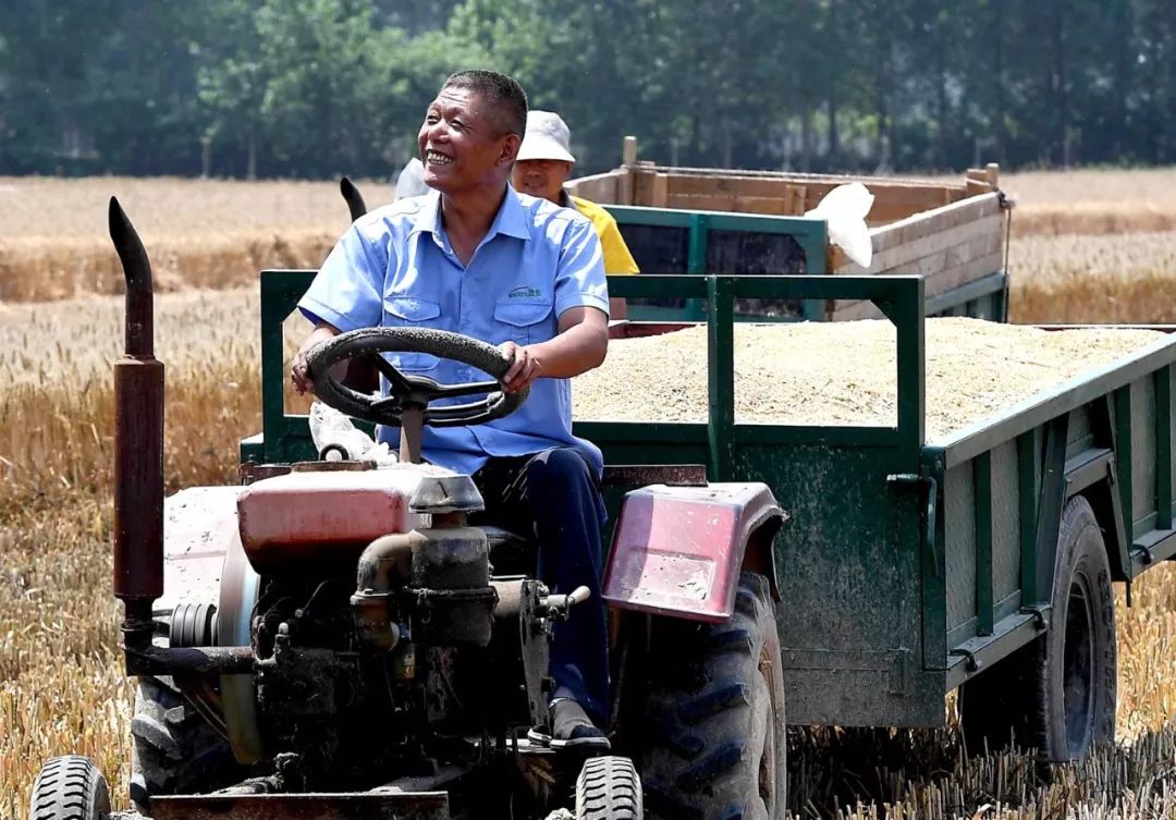 樊軍亭開(kāi)著裝滿(mǎn)小麥的拖拉機(jī)駛出麥田。