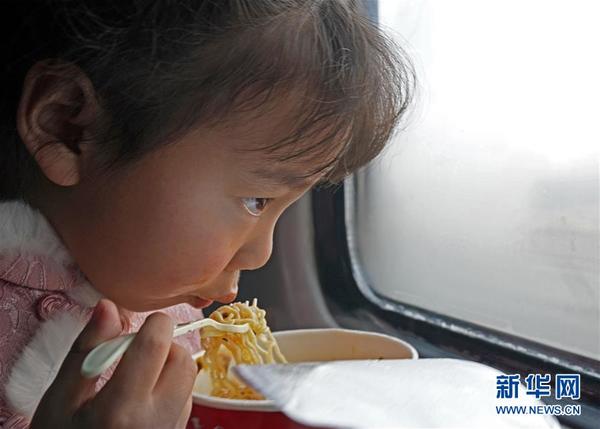 1月21日,在中國鐵路哈爾濱局集團有限公司齊齊哈爾客運段K497次列車上,一名小女孩在窗邊吃方便面。 新華社記者 才揚 攝