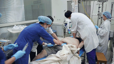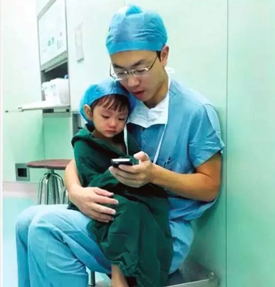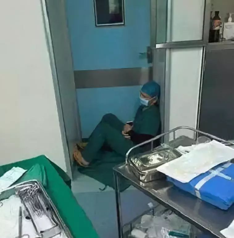 圖片中的醫生,在6臺高強度的手術之后,倚靠在手術室冰冷的墻上和衣而睡。