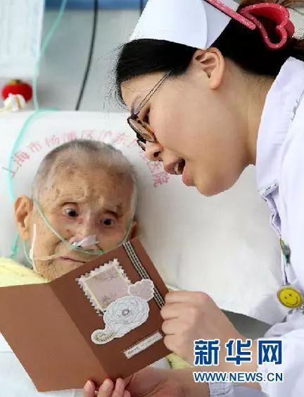 醫務人員將92歲的俞三妹老人的心愿寫在卡片上后讀給她聽。 新華社記者 陳飛攝
