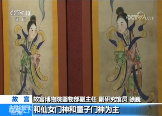 故宮博物院器物部副主任 副研究館員 徐?。洪T神都是成對兒的掛了,包括門身兩側還要懸掛對聯。一般門神也是根據不同的位置貼不同的門神,一般在外朝以武門神為主,一般在內廷以文門神、仙女門神和童子門神為主。