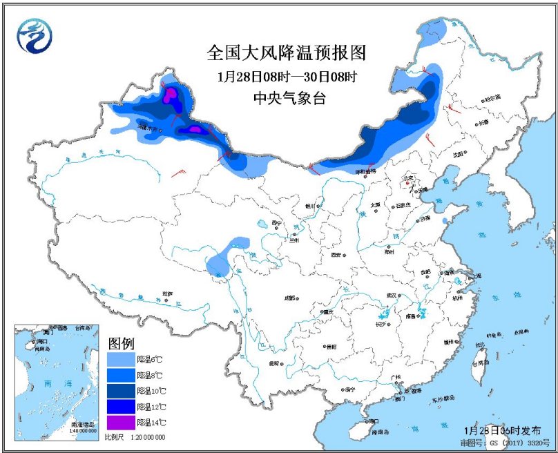 預計1月28日08時至30日08時,受強冷空氣影響,新疆北部、甘肅西北部、內蒙古北部和中部、青海南部等地氣溫將先后下降6~8℃,北疆北部、內蒙古中部偏北地區降溫幅度可達10~12℃,局地可達14℃以上,上述地區伴隨出現4~6級風、陣風7~8級,新疆風口風力可達9~11級,南疆盆地局地有沙塵天氣。中央氣象臺1月28日08時發布大風降溫預報。