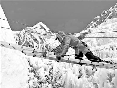 要說危險的也是最困難的,還是攀登珠峰的過程中,會遇到很多大大小小的冰裂縫,這些裂縫走向不明,深不見底,一旦墜入很可能丟掉性命。這時需要在裂縫上架梯子通過。人走在一尺寬的梯子上面會上下晃動,這對于使用假肢無法保持身體平衡的夏伯渝來說非常困難。登山杖失去作用,只能靠爬。而對于更多一米來寬的裂縫,一般人能一步跳過去,而受假肢限制,他只能大步跨。但這要危險得多,夏伯渝假肢沒有踝關(guān)節(jié)的緩沖,跨過去時重心是后仰的,很容易掉到裂縫中。這需要在裂縫對面的隊友,在其跨過的瞬間,適時把他拉過去。如果拉早了,假肢還沒有接觸到對岸,人就會掉到深不可測的裂縫中;如果拉晚了,夏伯渝身體產(chǎn)生的后坐力很有可能將幾個人一起拖入無底深淵。在隊友的幫助下,夏伯渝順利跨過了登頂珠峰途中遇到的近30個大大小小的冰裂縫。