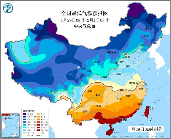 受強冷空氣影響,1月29日至2月1日,新疆南部和中東部大部地區將先后降溫6~8℃,其中內蒙古中東部、東北地區東部、江南東部和南部等地的部分地區降溫可達10~12℃。30日起最低溫度0℃線將從黃淮地區逐步南移,2月1日最低溫度0℃線將到達長江流域。長江中下游及以北地區將相繼出現4~6級偏北風;東部和南部海區有6~8級、陣風9級的大風。