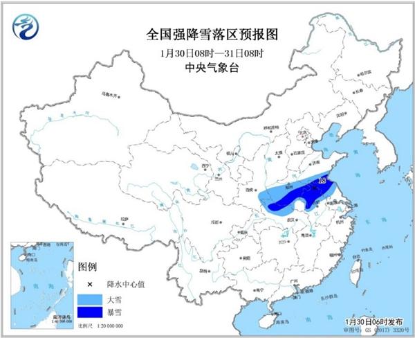 中央氣象臺1月30日06時發布暴雪黃色預警: