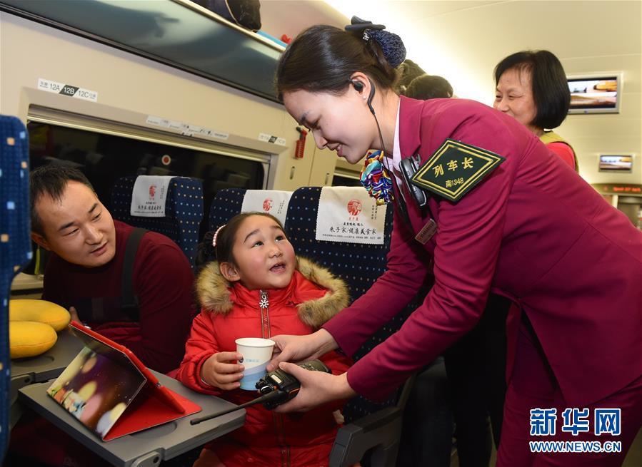 2016年2月6日,南昌鐵路局福州客運段列車工作人員廖輝在春運的列車上為乘客送去熱水。新華社記者姜克紅 攝