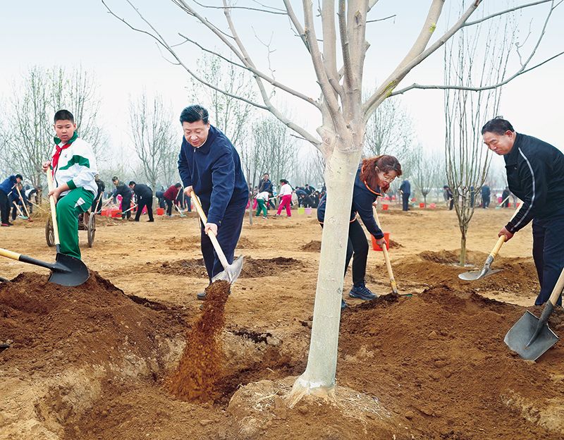 2018年4月2日,黨和國家領(lǐng)導(dǎo)人習(xí)近平、李克強、栗戰(zhàn)書、汪洋、王滬寧、趙樂際、韓正、王岐山等來到北京市通州區(qū)張家灣鎮(zhèn)參加首都義務(wù)植樹活動。這是習(xí)近平同大家一起植樹。 新華社記者 謝環(huán)馳/攝
