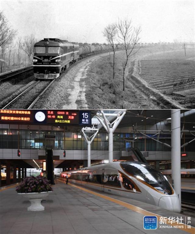 ↑拼版照片:上圖為1971年,北京二七機車車輛工廠試制的六千馬力液力傳動內燃機車在鐵路線上進行試驗(新華社記者周雙六攝,資料照片);下圖為2018年8月8日,一列復興號動車組列車抵達天津站。2018年8月8日,京津城際鐵路實施新的列車運行圖,復興號動車組按350公里時速運行(新華社記者張晨霖攝)。