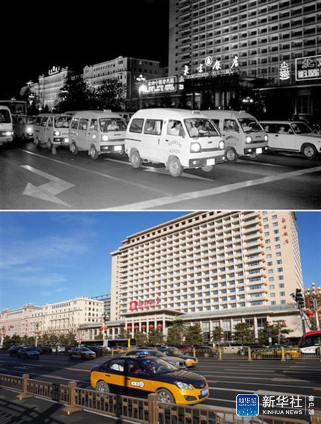 ↑拼版照片:上圖為1993年,幾輛出租車“面的”從北京飯店前駛過(資料照片);下圖為2019年1月28日,車輛從北京飯店前駛過(新華社記者鞠煥宗攝)。