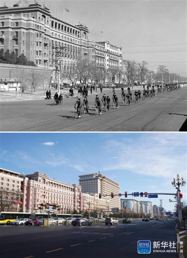 ↑這是一張拼版照片。上圖為1956年2月15日,北京、天津、唐山、保定、石家莊、張家口青年自行車比賽在北京舉行。這是比賽結束后,青年們騎車經過東長安街(新華社記者孟慶彪攝);下圖為2019年1月28日,汽車行駛在東長安街上(新華社記者鞠煥宗攝)。