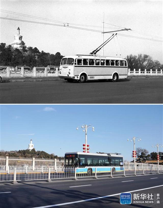 ↑拼版照片:上圖為1957年2月26日,首都第一條無軌電車線路開始營業性質的試運行(新華社記者楚英攝);下圖為2019年1月28日拍攝的行駛在文津街上的101路電車(新華社記者鞠煥宗攝)。