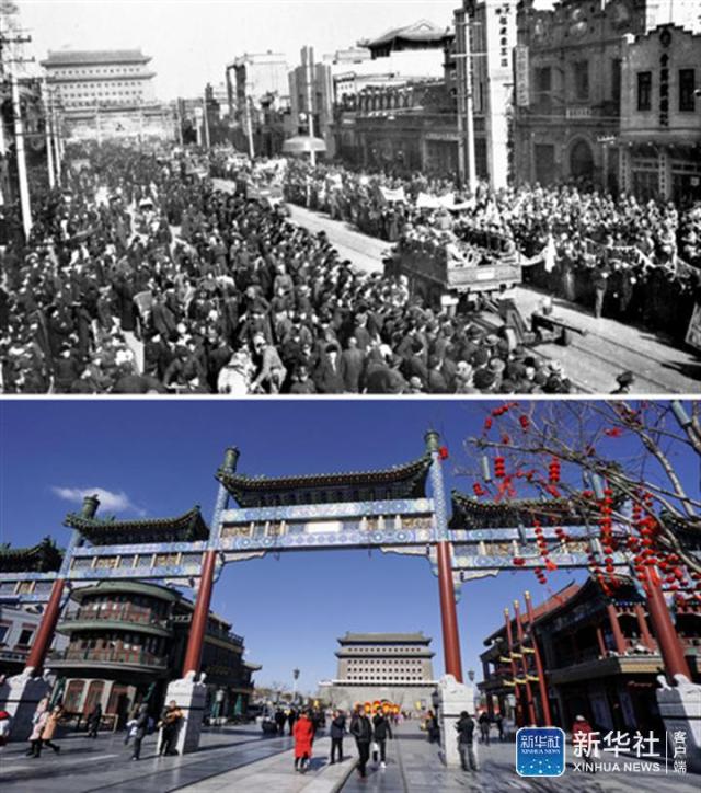 ↑這是一張拼版照片。上圖:1949年1月31日北平和平解放后,中國人民解放軍于2月3日舉行了入城式。這是北平市民在正陽門大街上夾道歡迎參加入城式的人民解放軍(資料照片);下圖:2018年2月25日,游客在北京前門大街步行街參觀游覽(新華社記者李欣攝)。