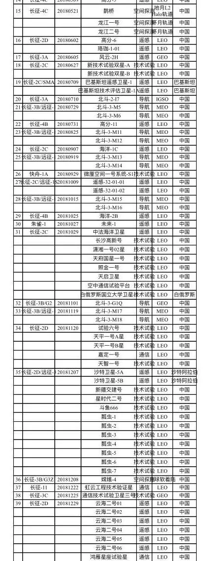 在藍皮書的末尾表格里,我們可以看到2018年發射的詳細信息。