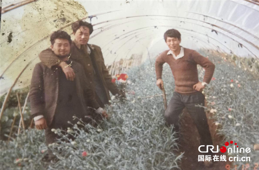 年輕時(shí)的華明升(右一)在鮮花大棚里。