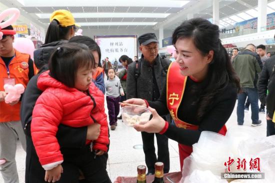 南寧鐵路局工作人員為旅客、農民工包餃子、送餃子、送春聯,共度小年。林馨 攝