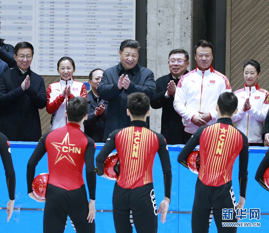 隨后,習近平來到國家冬季運動訓練中心,在短道速滑館結合展板聽取速滑、花滑項目介紹,之后進入館內察看國家速滑隊、花滑隊訓練備戰情況。看到運動員們在冰面上揮灑汗水、刻苦備戰,習近平表示贊許,叮囑他們科學訓練、注意安全。習近平步行前往冰壺館,察看國家冰壺隊訓練備戰情況。運動員、教練員看到習近平來了,爭相圍攏過來。習近平勉勵他們注重選拔培養好人才,增強為國爭光的榮譽感,堅定創造佳績的信心,刻苦訓練、全力備戰、勇攀高峰,力爭實現新的突破。冰壺館前廳的沙盤,展示了首鋼北區和冬奧會滑雪大跳臺規劃建設情況,習近平邊看邊問。他強調,體育強則國家強,國家強則體育強。發展體育事業不僅是實現中國夢的重要內容,還能為中華民族偉大復興提供凝心聚氣的強大精神力量。我們要弘揚中華體育精神,弘揚體育道德風尚,推動群眾體育、競技體育、體育產業協調發展,加快建設體育強國。考察結束時,習近平同運動員、教練員和工作人員代表等握手告別,現場響起熱烈的掌聲。