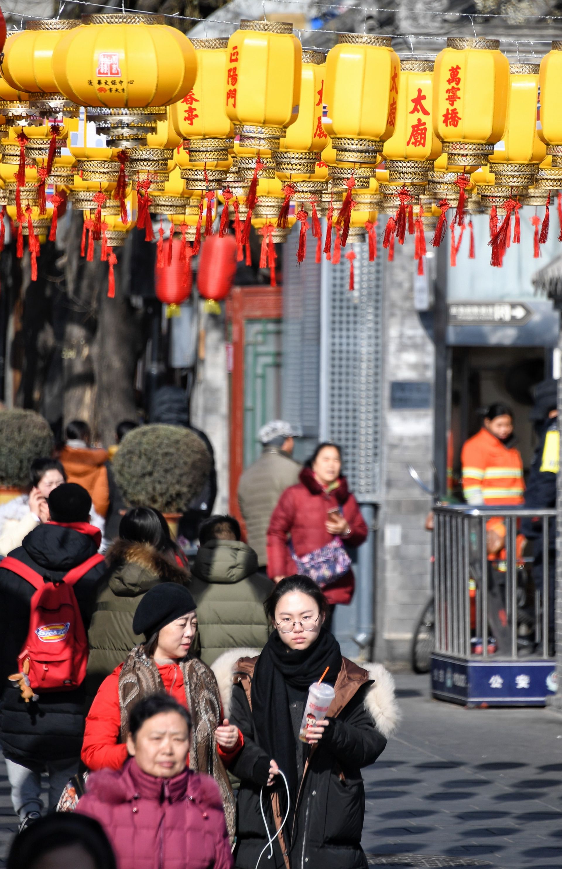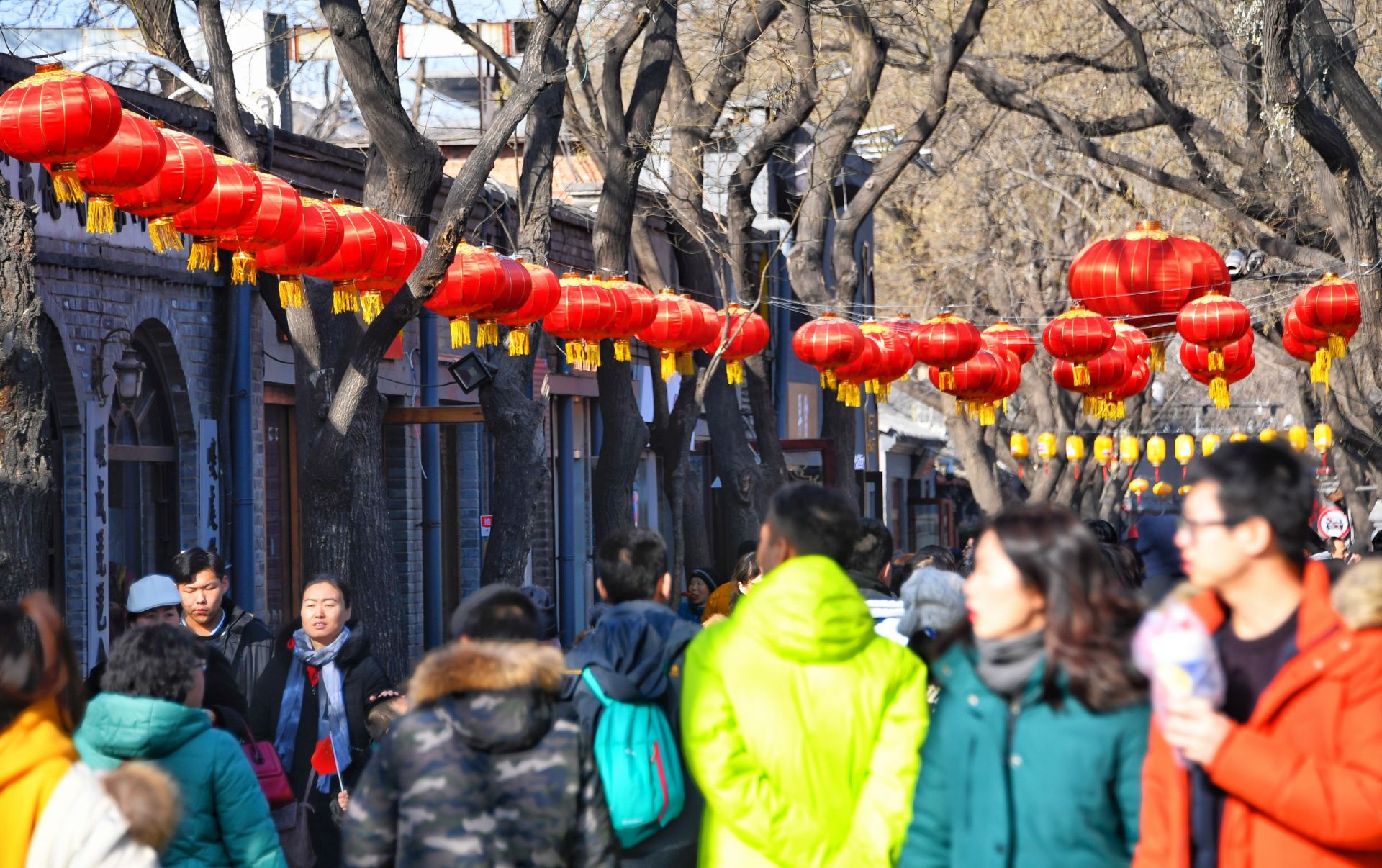 2月1日,游客在北京東城區(qū)南鑼鼓巷游玩。