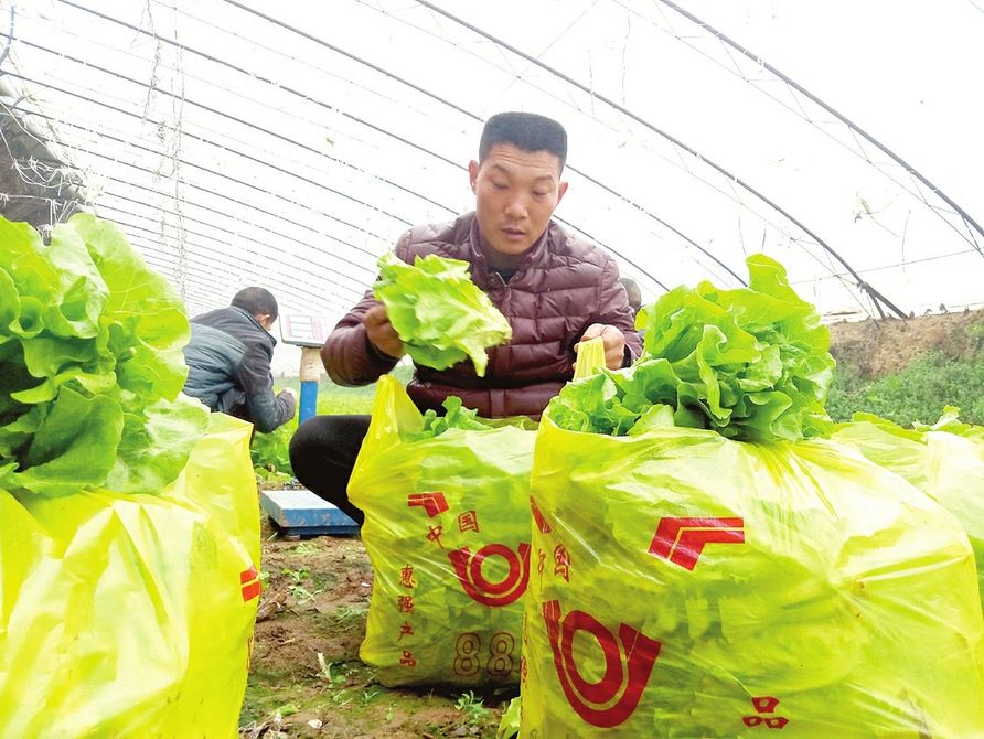 解江輝正在將采摘好的生菜裝袋。 本報記者周明飛攝