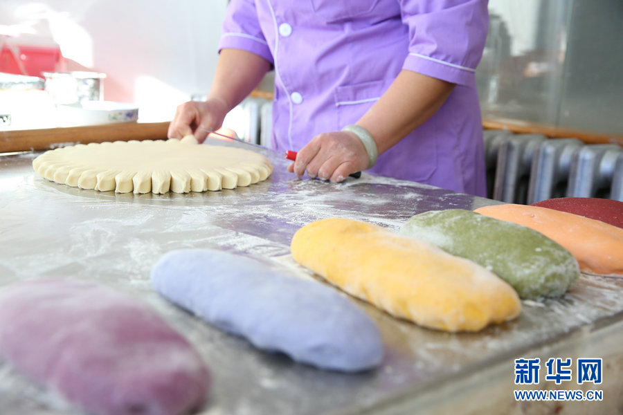 邱霞將各種顏色的果蔬加入和成彩色面團。(新華網(wǎng) 曹楨攝)