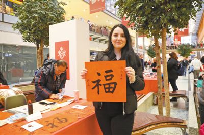 瑪蒂娜也是連續幾年都來波茨坦廣場參加活動,今年她特意請來自深圳的書法家徐子屏為她在紅紙上寫下“?!薄皦邸薄翱怠薄皹贰彼膫€大字?!耙淮尉褪斋@那么多來自中國的祝福讓我非常開心。感謝‘歡樂春節’活動,讓我們也能親身體驗中國年的喜慶氛圍”,她向記者展示了購得的剪紙作品,顯得非常開心。