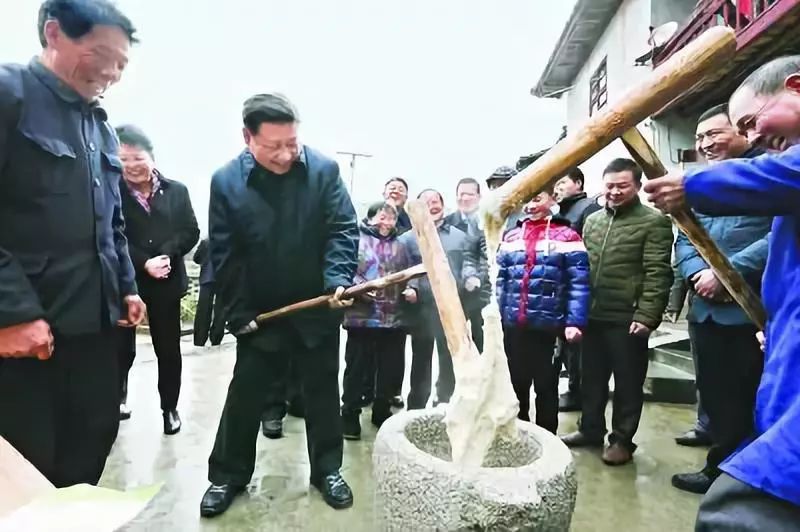 2018年2月12日,習近平總書記前往四川汶川縣映秀鎮考察。實地察看這里震后10年的發展振興情況。在當地群眾經營的制茶坊,總書記了解發展茶產業帶動群眾致富的情況,還親自操作打酥油茶。在村民開辦的飯店,總書記問生意怎么樣,一家人的生活過得好不好。他還體驗了炸酥肉和磨豆花的過程。總書記轉動磨盤,笑著說:“很練臂力啊,真是越磨越帶勁。”現場響起陣陣歡聲笑語。