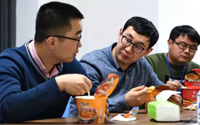 對這個在除夕夜堅持工作的科研團隊來說,年夜飯是個問題。單位遠離市區,晚飯時間叫不到外賣。團隊成員于濤從桌后翻出兩箱泡面,笑著說:“快來搶面!各種口味,先到先得。”而沖泡面的時候,他們還在討論工作。
