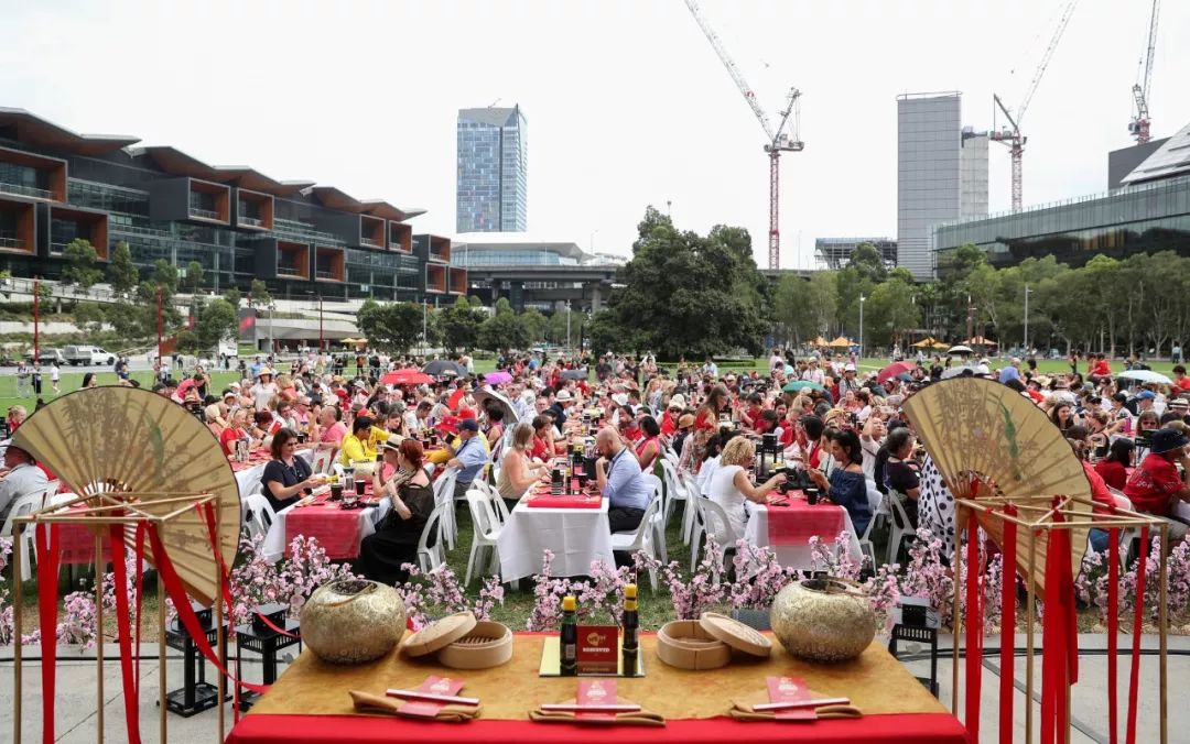 5日,澳大利亞悉尼市中心達令港的通巴隆公園內,一列列長桌整齊擺放,遠處的舞臺上裝飾著扇子、燈籠等中國傳統文化符號。場地外,早早聚集了數百名澳洲民眾和游客,等候入場的隊伍排起長龍。