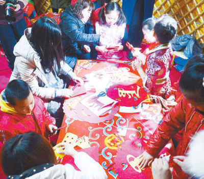 家長與孩子一起制作蒙古族福帖。內蒙古博物院供圖